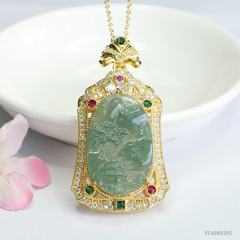 ファッションジュエリー ジェダイトペンダント ジルコンがちりばめられた手彫り天然ビルマ翡翠ペンダント 風景画ミャンマー翡翠ペンダント