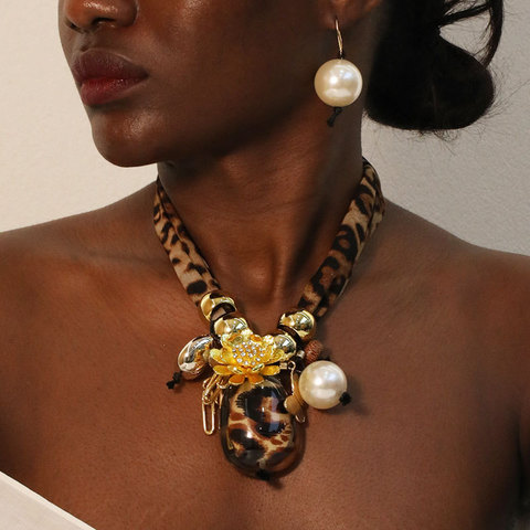Leopar baskı ipek eşarplar toptan, üreticiden inci kolye ve altın Metal aksesuarlar